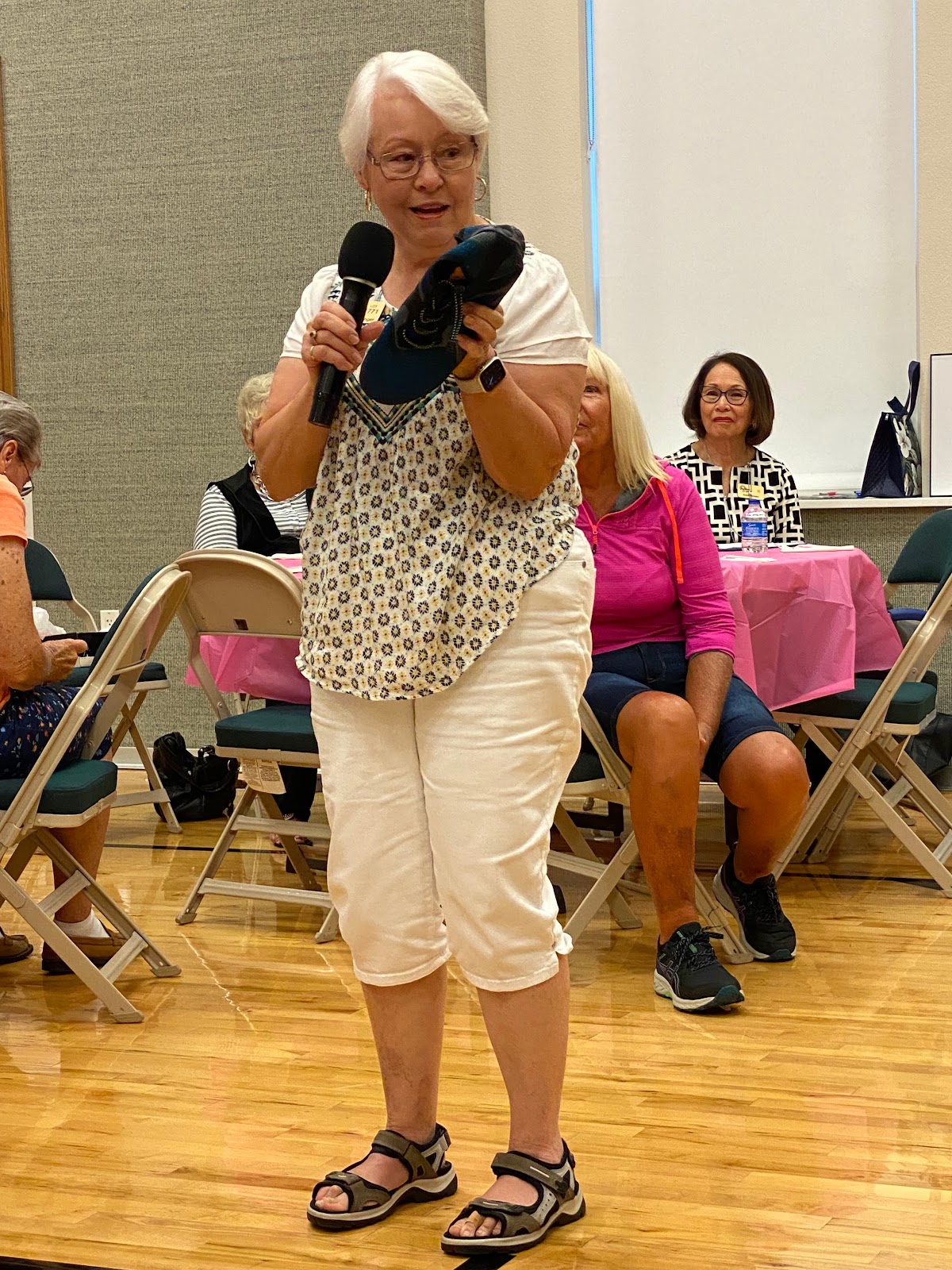 Stacey DeSilva showed a pair of shoes that she wore in a Fashion Show when Sue Olsen was Activities Committee Chairman.